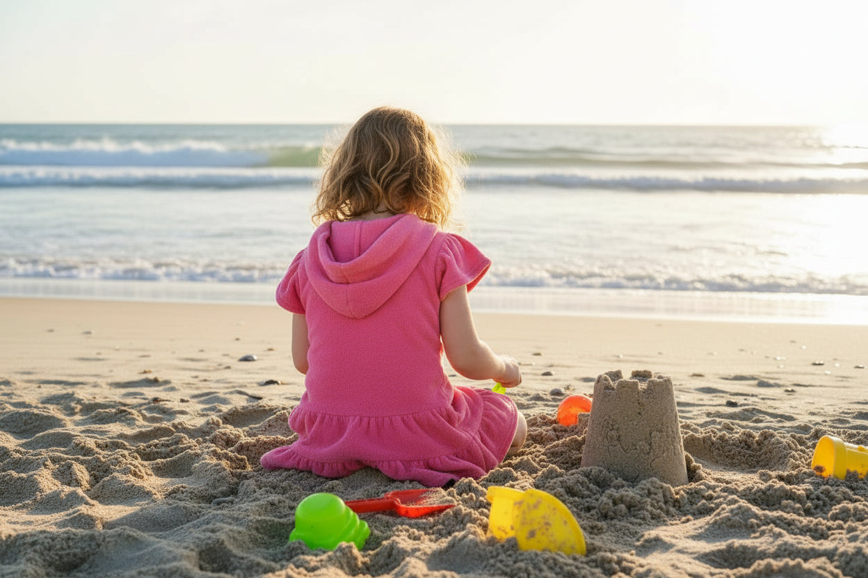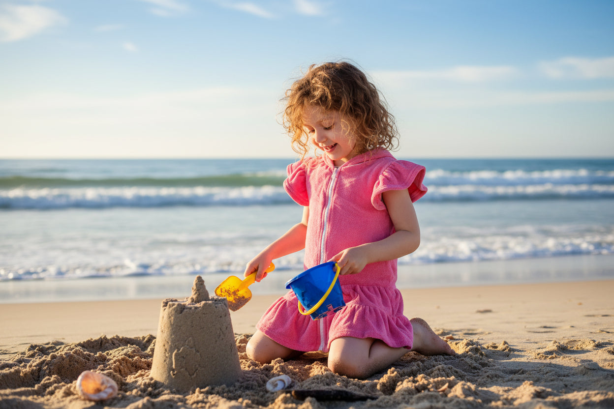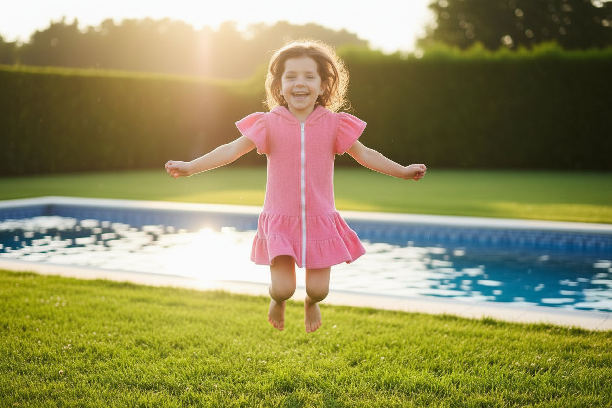 Nuestra salida de baño es la pieza esencial que no puede faltar en el bolso de playa de tus hijos. Olvídate de las toallas que se caen o incomodan: este diseño con cierre completo permite que nuestros niños se vistan en segundos, asegurando un calce perfecto para jugar cómodamente todo el día sin interrupciones.